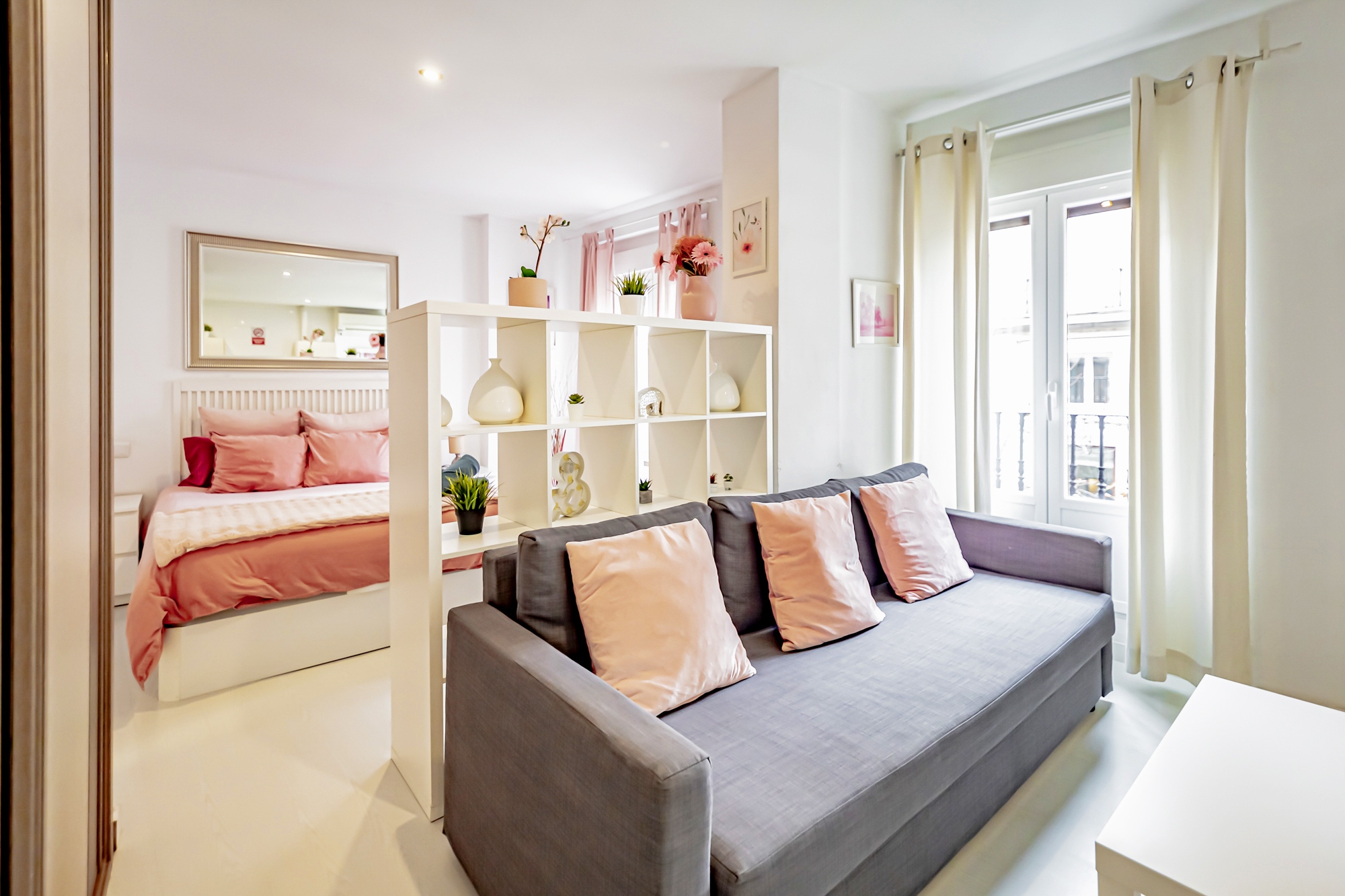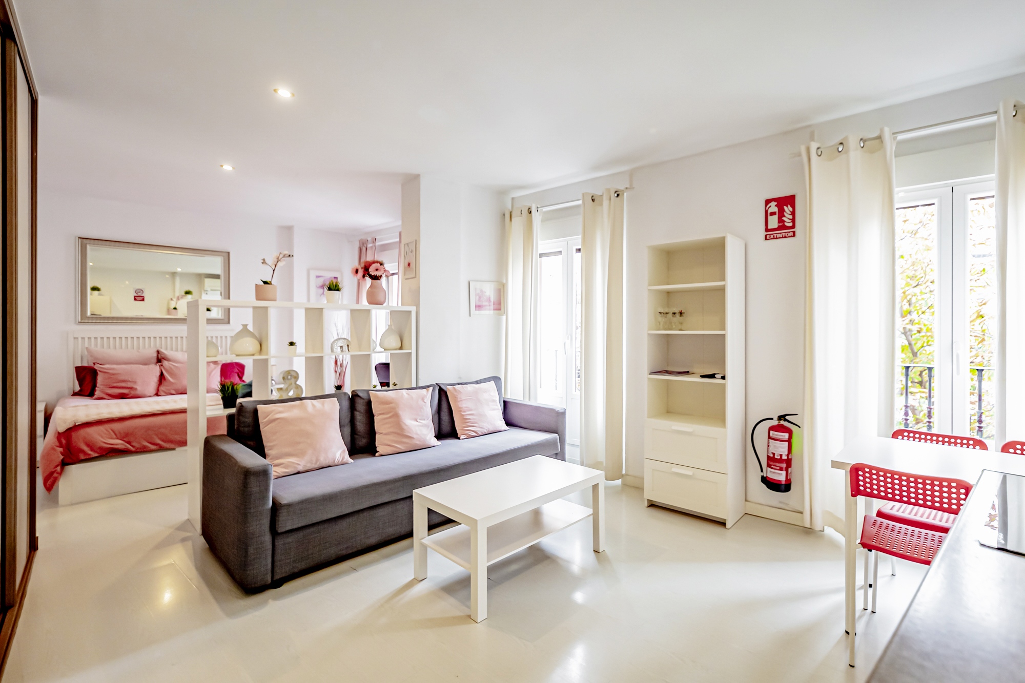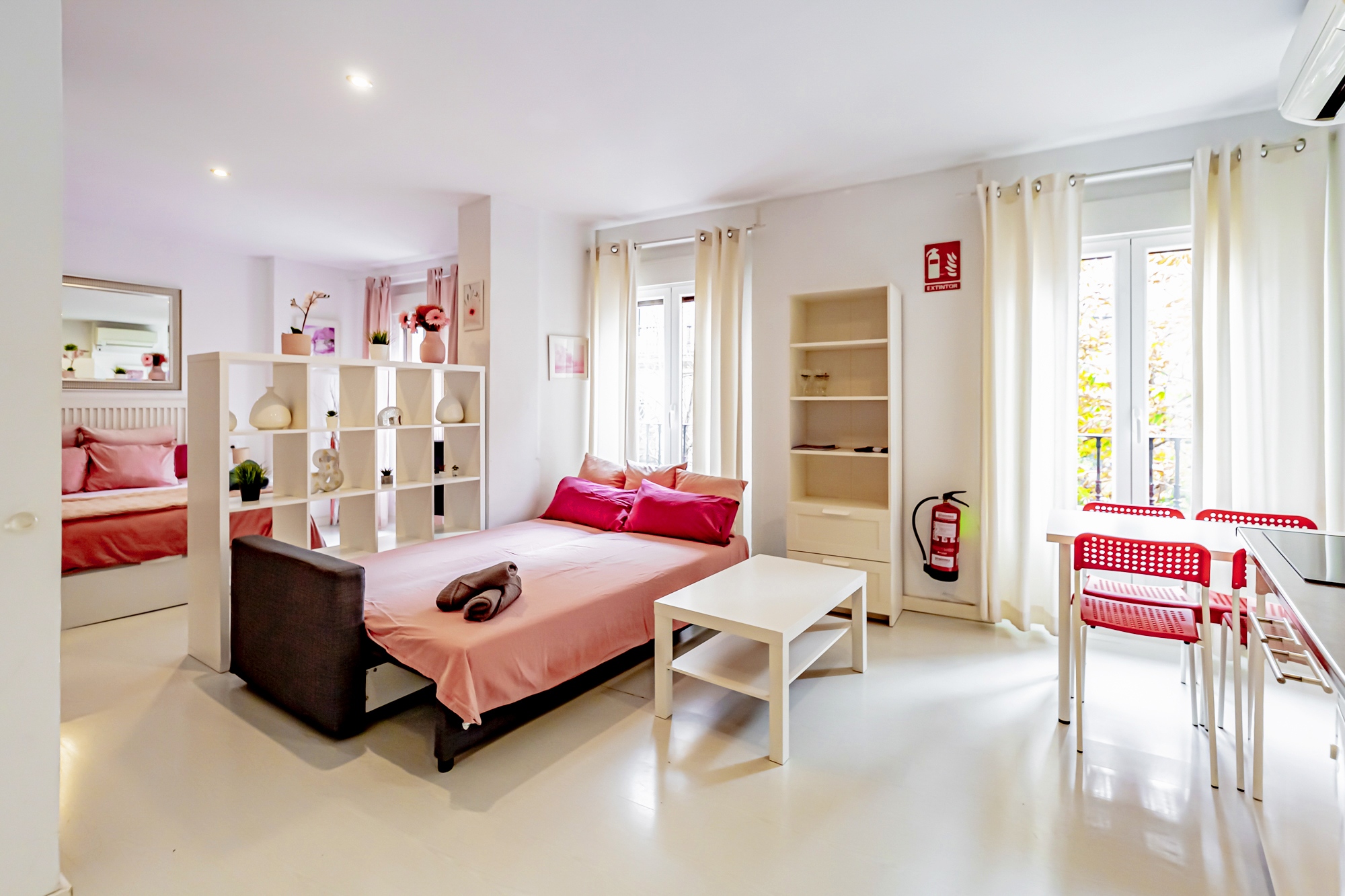 El apartamento cuenta con un dormitorio acogedor, un baño completo, un salón comedor luminoso con sofá cama, mesa de comedor, Smart TV y tres balcones a la calle, además de una cocina totalmente equipada que incluye lavavajillas para mayor comodidad. También dispone de aire acondicionado, calefacción y Wi-Fi velocidad. El apartamento está situado en la primera planta; el edificio tiene ascensor, pero no realiza parada en esta planta.