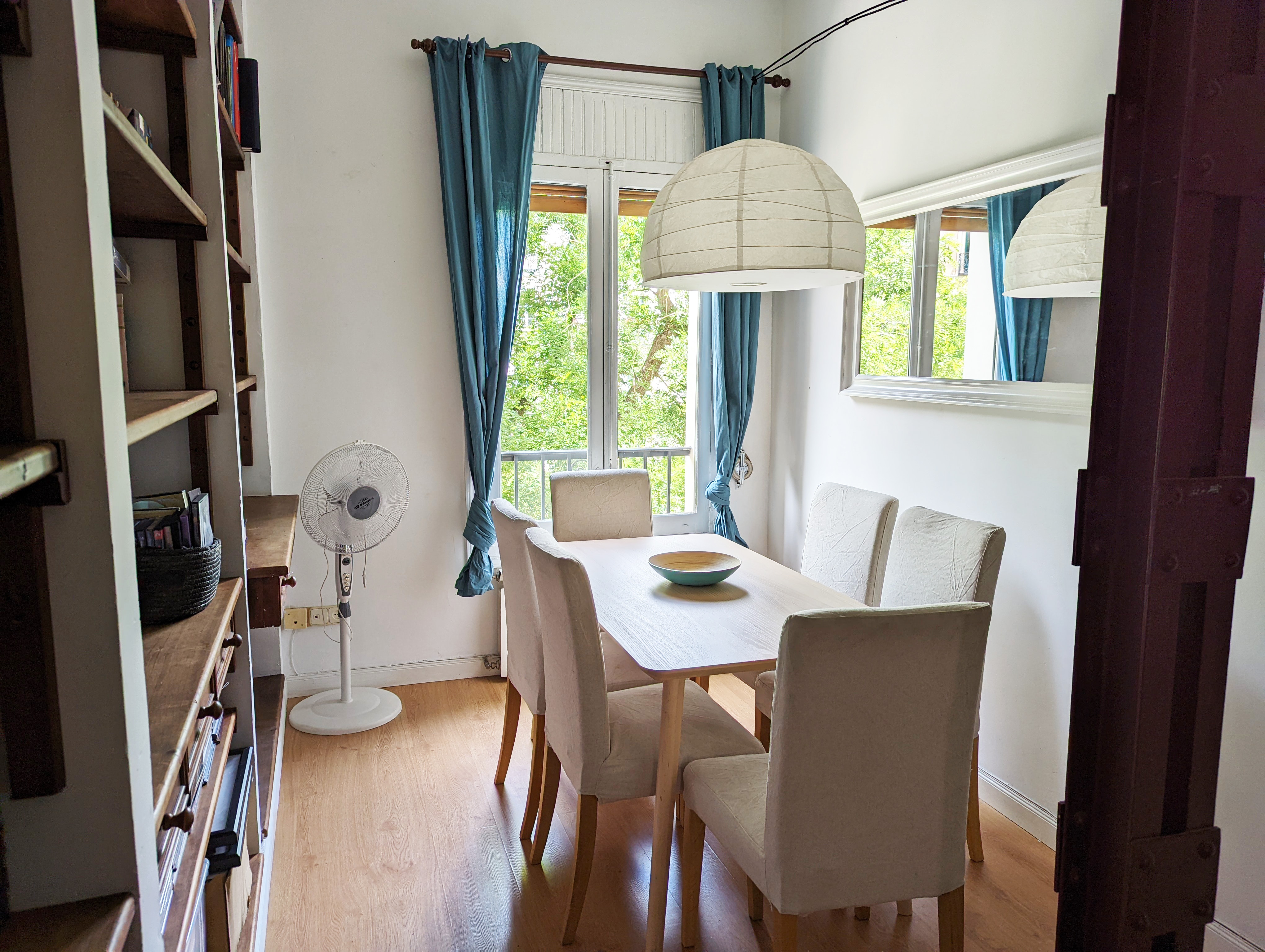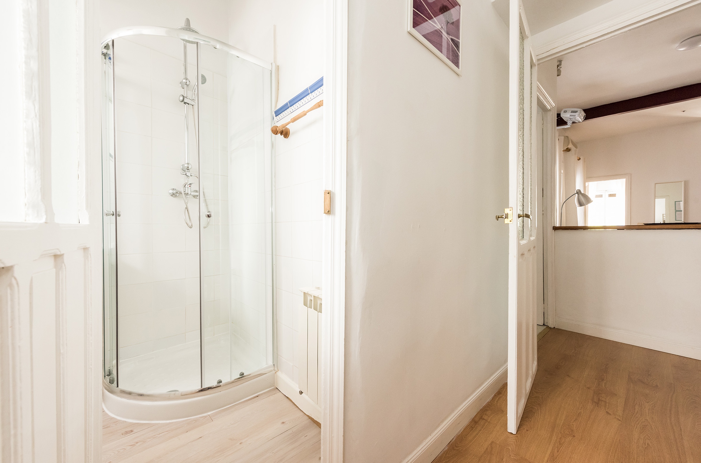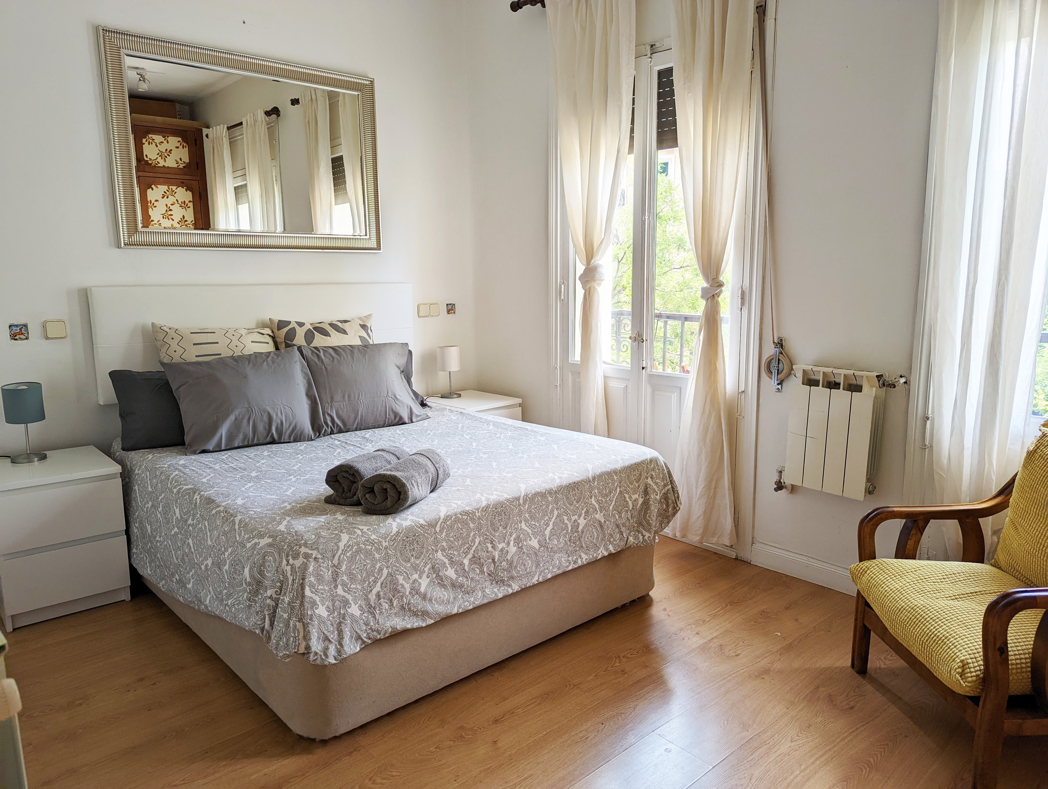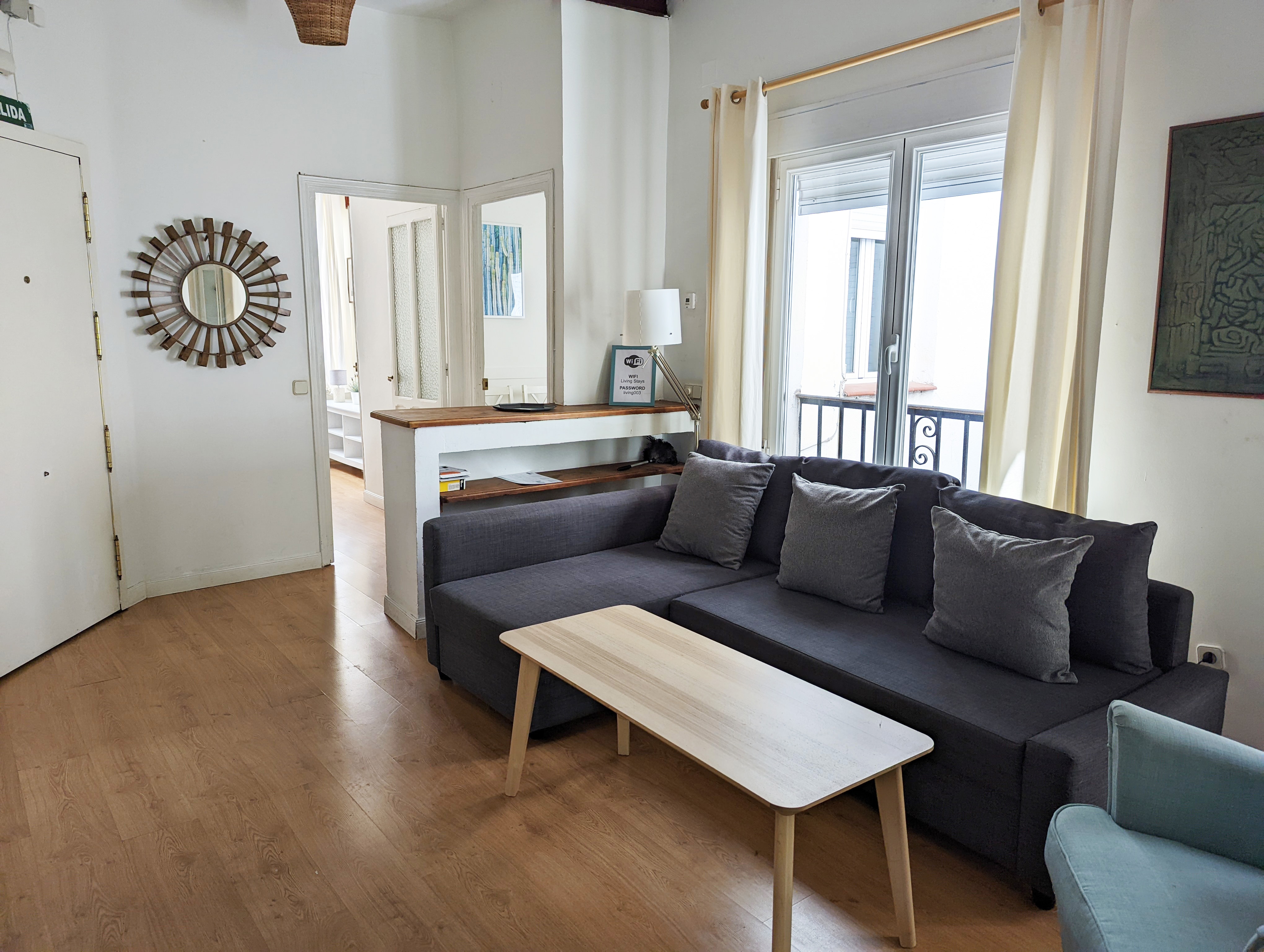 The apartment features two en-suite bedrooms —one double bedroom with two balconies overlooking Plaza de la Paja and one single bedroom— as well as a cozy living-dining area with a double sofa bed and a fully equipped kitchen, providing everything you need for a comfortable stay in the heart of Madrid.